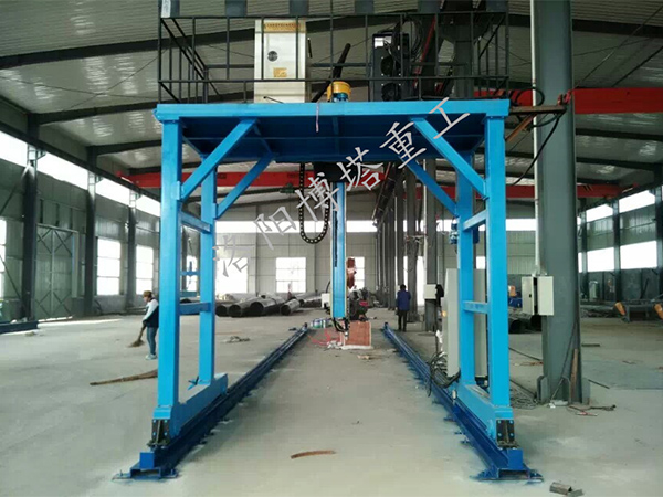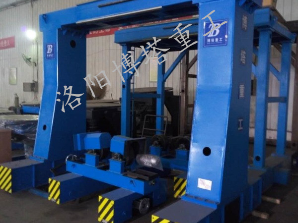 龍門架是本機的骨架部分,各部分均安裝于龍門架上,龍門架主要起支持各部分并帶動各部分以焊接速度行走的作用,其下部為兩個行走梁,由兩臺交流低速電機帶動龍門架在鋼軌上行走,另有兩對靠輪緊靠鋼軌兩側(cè)面,保證行走平穩(wěn),操作平臺設(shè)于龍門架中間位置,龍門架上平臺安裝了掛絲架及焊劑回收機等裝置。